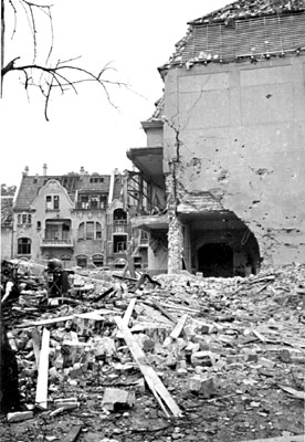 "Längst ist es November geworden. Dennoch schlagen auch aus dem Eckhaus an der Breiten Gasse - ebenso wie am Michaelisplatz und einige anderen Stellen in der Stadt - immer noch von neuem die Flammen aus den Trümmern. Diesmal will die Feuerwehr endgültig Schluß mit dem Feuer machen."