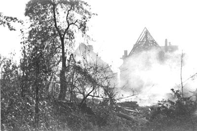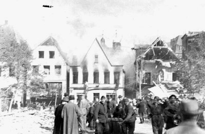 "Morgenfrühe 11. Okt. 43. Der vordere Teil des Timmerscheidthauses ist nur dadurch vor dem Feuer gerettet worden, daß die Bewohner den Brand im Hinterhaus durch die Steintrümmer abdämmten, da Wasser zum Löschen überall fehlte."