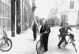Erste Wiederaufbauarbeiten in der Aegidiistraße: Im Vordergrund zwei Männer mit ihren Fahrrädern, die für den Wiederaufbau verantwortlich sind, im Hintergrund die Spuren von Dachdeckerarbeiten auf der Straße.