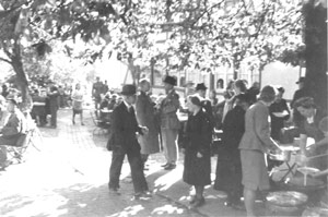 Garten der Kaffeewirtschaft Recklingloh am Aassee, Annette-von-Droste-Hülshoff-Allee 9. Frauen der NSDAP-Ortgruppe Adler bei der Ausgabe von Mittagessen an Bombengeschädigte.