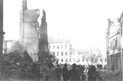 Bombenzerstörungen in der Rothenburg: links die Reste des Hauses und Geschäftes Niemann, Rothenburg 22; im Hintergrund die Aegidiikaserne.