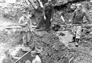 "Über zwei Meter tief haben die Oberschlesier S.H.D.-Männer schon gegraben, da finden sich endlich die ersten Kleidungsstücke der Vermißten. 'Wenn jetzt Angehörige der Toten kommen, so sagt man ihnen, sie mögen nach Mittag wiederkommen, denn der Anblick und der Leichengeruch seien für kranke Nerven unerträglich."