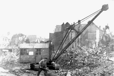 "In den Trümmern beiderseits des Eingangs zur Lütkengasse hat schon seit einigen Tagen der Kran mit den Aufräumungsarbeiten begonnen. Aber die Nachbarn prophezeien, daß er in diesem Jahr mit der Aufräumung in der Aegidiistraße nicht mehr fertig werden würde. - Kaum würde man sich in diesem Trümmerfeld auskennen, wenn nicht links der Lambertikirchturm über den Dächern eine Orientierung sicherte."