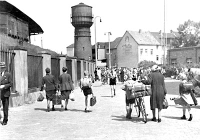 Hauptbahnhof; im Vordergrund die zwei Kinder und die Ehefrau von Dr. Wiemers "Am Osteingang des Hauptbahnhofes versammeln sich schulweise die Jungen und Mädel, für die heute der Transport-Zug losfährt."