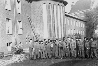 "Hinter dem Gauhaus ist gerade ein Trupp H.J.-Jungen angetreten, die schon seit dem 10. Oktober im Einsatz zur Wiederherstellung behelfsmäßiger Telefonleitungen für die Truppe Verwendung finden."