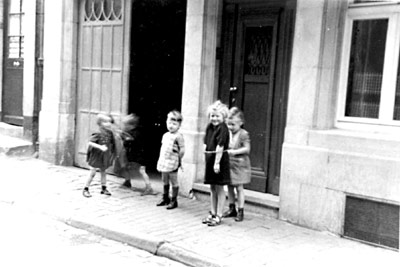 "Diese fünf Kleinen in der Breiten Gasse spielen gerade 'Luftschutzkeller'. Komm schnell mein Kleines, sagt der Junge links zu dem kleinen Mädchen. Ich ziehe Dir schnell Dein Mäntelchen für den Keller an. Als ich die beiden zur Rechten frage, was sie machen, sagt die Eine: 'Ich muß die Mia schnell verbinden, sie hat einen Splitter abgekriegt.' Dabei bindet sie ihr einen Bindfaden so um den Bauch, daß die Hände mit festgebunden werden."