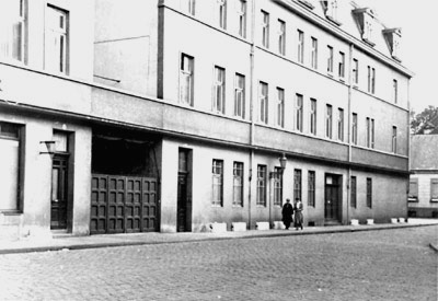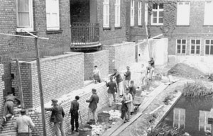 Häuserzeile mit zugemauerten Kelleröffnungen zum Schutz vor einfließendem Phosphor, dass bei Bombenabwürfen auf die Stadt niederging.