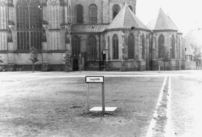 "Über dem unterirdischen Löschwasserbecken auf dem Domplatz. - Löschwasser ist jetzt das wichtigste Erfordernis bei den Grossbränden, die durch die Phosphorbomben in allen angegriffenen Städten hervorgerufen werden. Darum findet man jetzt überall in der Stadt Schilder, die den nächsten Löschwasser-Teich anzeigen."