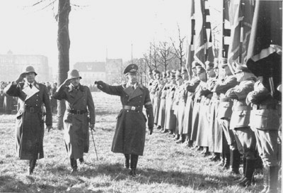 "Heldengedenktag auf dem Hindenburgplatz in Münster. Der Gauleiter schreitet mit den beiden Kommandeuren die Front der Parteifahnen ab."