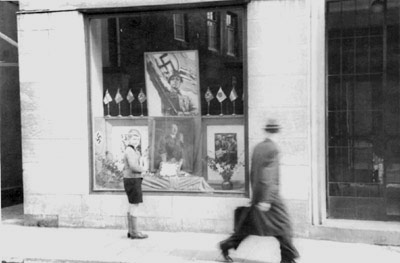 Aufwändig gestaltetes Schaufenster anlässlich des Geburtstags von Adolf Hitler. Es handelt sich um das Schaufenster der Freizeitorganisation der Nationalsozialisten "Kraft durch Freude" in der Aegidiistraße 14.