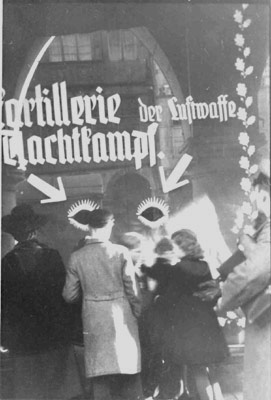 "Unsere Flak veranstaltet Ausstellungen in den Schaufenstern. So sieht das Fenster unter dem Bogen bei Petzhold aus, wo die sich andrängelnden Leute auch alle gern durch die beiden Gucklöcher die Flakartillerie der Luftwaffe beim Nachtkampf um Münster sehen möchten."