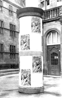 "Auch die Litfaßsäulen im Juni 1943 lassen spüren, daß alles, was in der Stadt lebt, auf den totalen Krieg eingestellt ist. An den Litfaßsäulen steht: Heraus mit euern alten Spinnstoffen und alten Schuhen! - Stifte sie, damit wir umso schneller siegen."