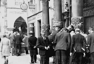 "Vor dem Stadtweinhaus machen sich jetzt jeden Tag der Losverkäufer und der Verkäufer der Musterungsabzeichen für die gemusterten Soldaten Konkurrenz, denn täglich finden jetzt im Rathaus und im Stadtweinhaus Musterungen statt, bald von 17-jährigen jungen Leuten, bald von Männern von etwa 40 bis zu 45 Jahren."