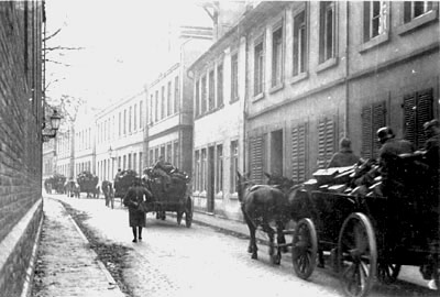 "Frühmorgens kommt eine große Anzahl von Militärfahrzeugen durch die Schützenstraße. Wohin wollt Ihr mit den vielen Koffern? Ihr rückt doch nicht mit Koffern ins Feld? - Nein, die Lazarette in der Stadt werden geräumt und in die Landorte verlegt. Wir bringen das Gepäck nach auswärts. - Wohin denn? - Dienstgeheimnis."