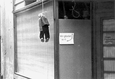 Puppe am Galgen vor einem geschlossenen Tabakgeschäft in der Aegidiistraße. Das Schild warnt: Wer plündert wird erschossen! Derartige Warnungen vor Plünderungen sollten die Bevölkerung einschüchtern.