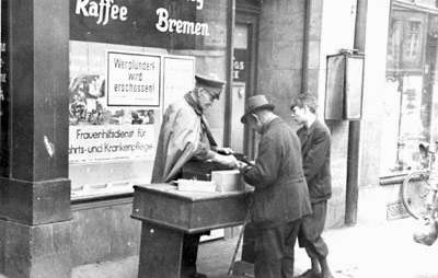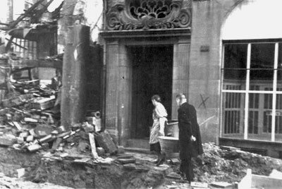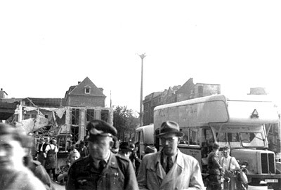 "In zahlreichen Straßen, wie hier am Drubbel, sieht man immer noch die Plakate angeschlagen: Wer plündert wird erschossen! - Aber man sagt, umso mehr würde trotzdem heute gestohlen, im Durchschnitt pro Tag 20 Fahrräder."