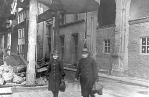 "Aus dem Eingang der Marievengasse kommt gerade der alte Schlossermeister aus dem zerstörten Achtermann-Haus mit seiner Tochter heran. Sie seien seit Monaten schon in einem Dorf bei Münster untergebracht. Sie hätten aus den Trümmern noch kleine Erinnerungen zusammengeholt."