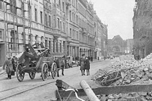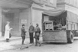 Evakuierung von Möbeln durch Zwangsarbeiter vor dem Möbelhaus Rincklake