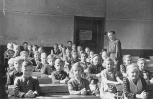 Diese Klasse einer Dorfschule im Umland von Münster besuchen auch Schülerinnen und Schüler aus der Stadt Münster. In Münster selbst waren zahlreiche Schulen total zerstört und viele Kinder in den Lagern der Kinderlandverschickung in Oberbayern untergebracht.