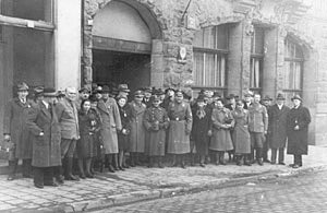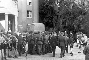 "Nur vor Küpper-Fechtrup am Marienplatz herrscht gegen 10 Uhr Leben in der sonntäglich stillen Stadt. Die Ortsgruppe Adler hat heute einen Schulungsredner für die Ortsgruppe eingeladen. Die Aufnahme nach Schluß des Schulungsvortrages zeigt, daß der Besuch mit etwa 50 Personen nicht schlecht war. Auf dem Foto erkennt man ebensoviel Frauen wie Männer. Alle warten in Ruhe bei der Fotoaufnahme, obwohl eben gerade Voralarm gegen ist. In der Mitte der stellvertretende Ortsgruppenführer."