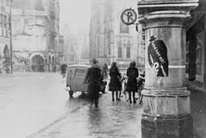 Chronikeintrag vom Februar 1944 "Auch in Münster ist im Januar überall an den Straßenecken 'Der schwarze Mann' angemalt gewesen, der hier in Norddeutschland zu allerlei seltsamen Vermutungen Anlaß gegeben hat, die man in Süddeutschland nicht gehört hat. Eins dieser Gerüchte lautet: Die Anschläge richteten sich gegen 'die Schwarzen', nämlich gegen die katholischen und evangelischen Geistlichen. Nach einigen Tagen haben Überklebzettel die Antwort auf das Fragezeichen gegeben: Haltet den Mund, Redet nicht soviel, - der Feind hört mit."