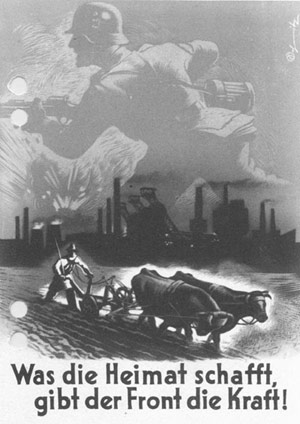 Aus einer Sammlung von Propagandapostkarten, die im August 1944 zur Chronik kamen. "Was die Heimat schafft, gibt der Front die Kraft!" stand auf der Karte gedruckt."