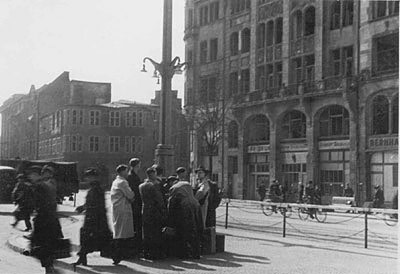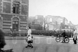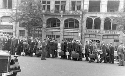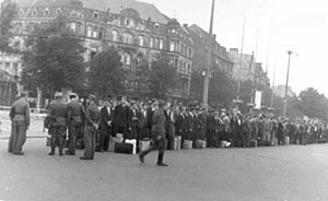 Im September 1944 steht eine lange Schlange von Rekruten mit Gepäck in der Bahnhofsstraße (damals: Adolf-Hitler Straße).