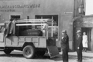 "Eben ist der Wagen des Kameradschaftswerkes der Eisenbahner in der Schillerstraße wieder startbereit, um wie an allen Einsatztagen zu den Mahlzeiten das Essen an die Einsatzstellen der Arbeitstrupps in der Umgebung von Münster zu bringen, wo die Schienenstränge wieder hergestellt werden."