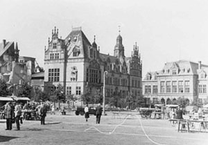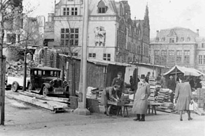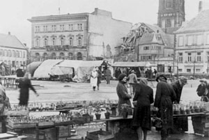 Marktstände vor den zerstörten Gebäuden des Landesmuseums und der Reichspost; davor steht ein Marktordner im April 1944.