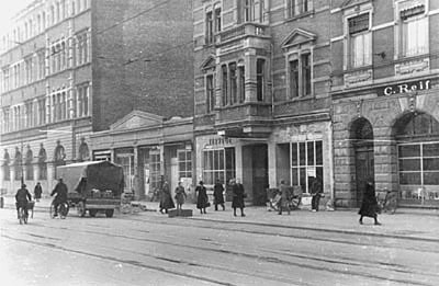 "Hauptverkehrszeit um 12 Uhr mittags auf der Hammerstraße. Die Lebensmittelstapel vor dem Gemüsegeschäft Terwege sind beträchtlich kleiner geworden gegen früher."