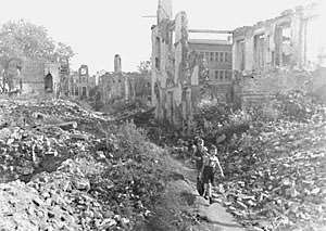 Zwischen 1939 und 1945 hatten die Einwohner mehr als 1100 Luftalarme (532 Tages-, 596 Nachtalarme) erlebt. Dabei fiel die zweite Hälfte der Alarme auf die 15 Monate von Januar 1944 bis 1945. Mindestens 102 Luftangriffe trafen die Stadt, die damit von allen Städten Nordrhein-Westfalens neben Köln und Aachen die am schwersten getroffene darstellte. Rund 32 000 Sprengbomben; ca. 642 000 Stab-Brandbomben und mehr als 8100 Phosphor-Kautschuk-Benzol-Kanister legten vor allem die Altstadt in Schutt und Asche.