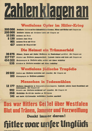 - Von den 708 vor dem Krieg in Münster ansässigen Jüdinnen und Juden starben 275 in Konzentrationslagern, nur 24 Menschen überlebten diese Zeit; weiteren vier Menschen war es geglückt, im Untergrund zu überleben; der nationalsozialistische Terror trieb sieben Menschen in den Selbstmord und 280 Personen in die Emigration; 77 Personen verstarben im Zeitraum von 1933 bis 1945; das Schicksal von 42 Menschen ist unbekannt.