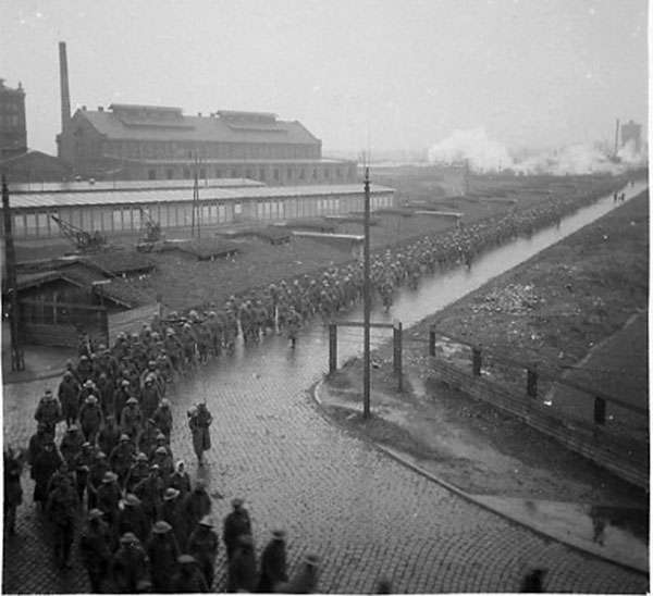 'Hauptsächlich aus der Festung Maubeuge, die am 7. mit 40.000 Mann, 4 Generälen, 400 Geschützen und zahlreichem Kriegsmaterial kapituliert hat, trafen hier die ersten Gefangenen ein. Die Sonderzüge wurden auf die Strecke Münster-Burgsteinfurt geleitet und die Gefangenen in Nienberge ausgeladen, von wo ihr Marsch zum Truppenexerzierplatz beim Hause Spital erfolgte.'