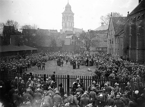 'Das Landsturm-Bataillon Münster II rückte nachmittags feldmarschmäßig gekleidet ins Feld. Ohne Rücksicht auf den eisigen, flackernden Wind harrten die Angehörigen und andere Zuschauer fast eine Stunde auf dem Roggenmarkt und an der Neubrückenstraße auf den Abmarsch der 1000 Mannschaften. Die erwachsenen Zuschauer waren recht ernst gestimmt, so daß nur die Kinder sich an den Liedern der Soldaten beteiligten. Es war, als wenn mancher in jedem Soldaten einen Todeskandidaten sähe.'