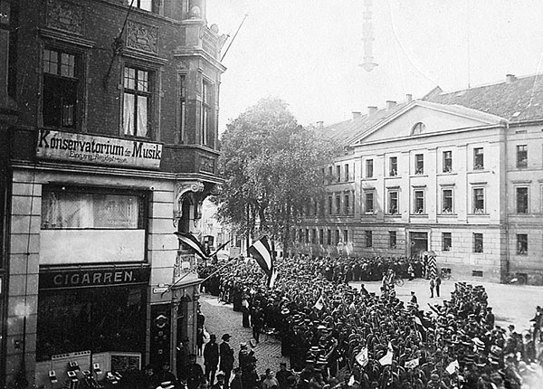 'Gegen 11 Uhr wurde unserer Feldartillerie eine gewaltige Abschiedskundgebung dargebracht. […] Von Blumenregen überschüttet, zog die Artillerie über den Markt durch eine begeisterte Menschenmenge, die mit Händen, Hüten und Tüchern Lebewohl winkte und das Rasseln der Geschütze und Wagen, von denen manche wie zum Blumenkorso geschmückt waren, und das Spiel der auf den Michaelisplatz abgeschwenkten Regimentskapelle mit Zurufen und Liedern zu übertönen suchten.'