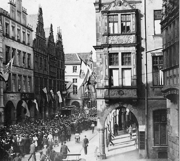 'Durch die fahnengeschmückten Straßen trat des Mittags ½ 1 Uhr ein Ersatzbataillon der Dreizehner den Ausmarsch an. Auf dem dichtbesetzten Prinzipalmarkt wurde den blumengezierten Soldaten die übliche schöne Kundgebung dargebracht. Die Schüler und Schülerinnen sämtlicher Lehranstalten hatten dafür diese Stunde freibekommen und standen singend auf dem Markt. Vor der Lambertikirche winkte eine große Kinderschar mit schwarz-weiß-roten Fähnchen ihre Abschiedsgruß.'
