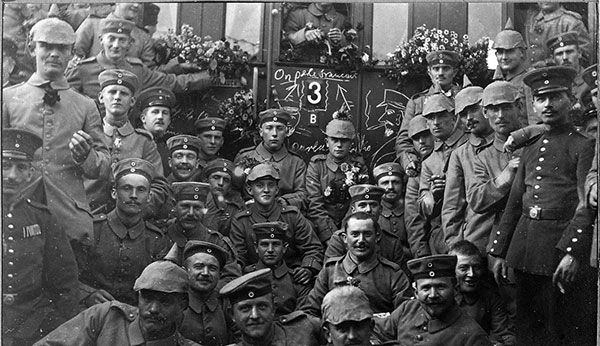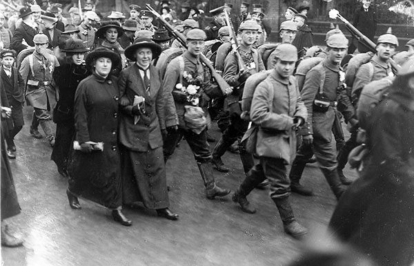 Im Lauf der ersten Augusthälfte rücken erste Truppenteile, darunter das in Münster besonders beliebte 13. Infanterieregiment Herwarth von Bittenfeld, an die Westfront ab. Sie werden in feierlichem Rahmen verabschiedet und marschieren zum Abtransport mit der Bahn durch die Innenstadt. Schilder mit der Aufschrift 'Auf zur Bärenjagd' oder 'Bald winken die 13ner vom Eifelturm' demonstrieren Siegeszuversicht und Geringschätzung des Gegners und damit eine erhebliche Unkenntnis der realen Situation.