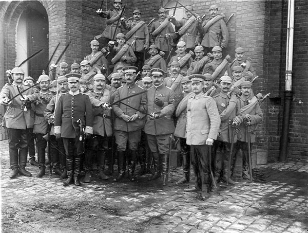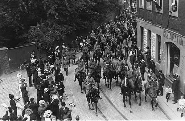 'In der letzten Nacht rückte das I. Bataillon des Infanterieregiments Herwarth von Bittenfeld erstes Westfälisches Nr. 13 aus. Die Nachbarhäuser der Hörster- und der Lotharingerkaserne erstrahlten in bengalischer Beleuchtung. Unter wehenden Fahnen, begleitet von tausenden Menschen zog das Bataillon zum Bahnhof, von wo kurz nach 12 Uhr der Zug gegen Westen nach Belgien fuhr, während die Musik noch einmal spielte: Muß i denn, muß i denn zum Städele hinaus.'