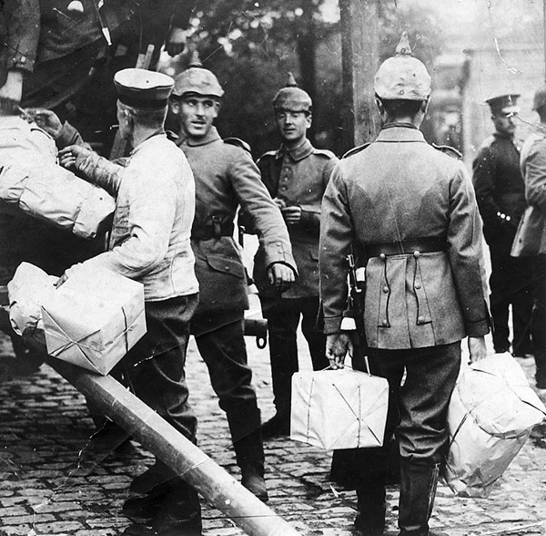 'Die schöne Sitte der Stadtverwaltung, von hier ausrückenden Ersatzmannschaften Pakete mit Wollsachen, Tabak usw. für ihre bereits im Felde stehenden Kameraden mitzugeben, wird regelmäßig wiederholt.'