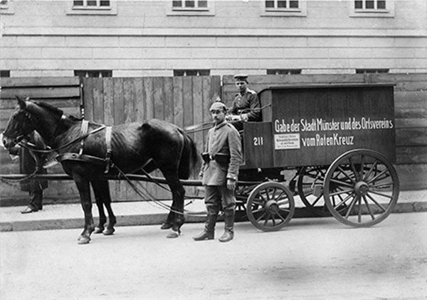 'Nachdem aus den beiden hiesigen Abnahmestellen freiwilliger Gaben für das VII. Armeekorps (Steinfurterstr. 11 und Alter Steinweg 17/18) zu Anfang dieses Monats bereits eine Ladung Liebesgaben an die Sammelstelle in Wesel abgeliefert war, sind zwei Eisenbahnwagen für unsere Dreizehner ins Etappengebiet abgegangen: über 150.000 Zigarren, 20.000 Zigaretten, große Mengen Tabak, über 5 Zentner Schokolade, große Mengen anderer Lebensmittel, Tausende von Hemden, Strümpfen, Fußlappen und anderen wollenen Bekleidungsstücken.'