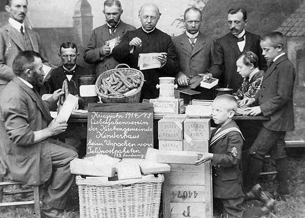 Mit zahlreichen propagandistisch angelegten 'Liebesgaben'-Spendenaktionen unterstützen die Daheimgebliebenen - die 'Heimatfront' - die kämpfenden Soldaten. Zu den Liebesgaben zählen Nahrungs- und Genussmittel, Bekleidung, sogar eine Kriegsbücherei.
