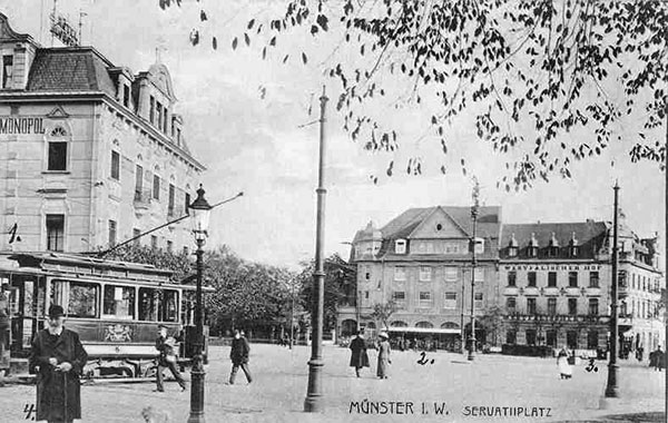 'Seit dem Kriegsausbruch hatte der Aschendorffsche Verlag am Geschäftshause der Firma Feldmeyer-Zapp am Servatiiplatz Lichtbildvorführungen mit den wichtigsten Kriegsdepeschen und Bildern von Heerführern und Kriegsschauplätzen veranstaltet. Dabei wurden auch etwa 60 Lichtbilder aus dem bewegten militärischen Leben unserer Stadt […] gezeigt […]. Da die wichtigen Nachrichten vom Hauptquartier jetzt in der Regel erst gegen Mitternacht ausgegeben werden, sind die Vorführungen von heute an eingestellt.'
