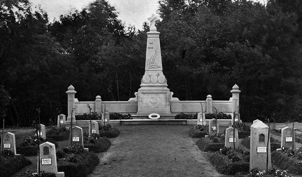 'Auf dem Friedhof der Kriegsgefangenen beim Lager Haus Spital wurde in Gegenwart von Vertretern des hiesigen Generalkommandos, der Inspektion der Gefangenenlager, der Lagerkommandanten und im Beisein von Abordnungen von Gefangenen aus den hiesigen drei Lagern ein Denkmal eingeweiht. Es ist entworfen und ausgeführt von dem kriegsgefangenen Architekten und Bildhauer Duboit. Ein aus Gefangenen gebildetes Orchester blies einen Trauerchoral. Ein französischer Geistlicher hielt die Einweihungsrede. Danach sprachen zwei Gefangene Widmungen. Nach einem Trauermarsch zogen alle Gefangenenabordnungen an dem Denkmal vorbei, dessen Sockel mit vielen von ihnen gestifteten Kränzen belegt war.'
