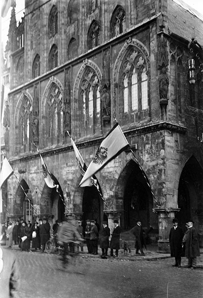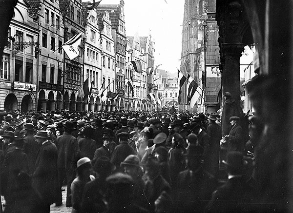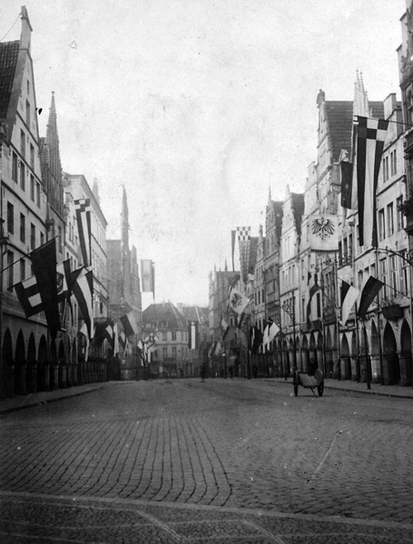 'Am Vormittag war ein Berliner Telegramm darüber angeschlagen, [...]'Großer Sieg in den Karpathen, Näheres noch unbekannt', und daß am frühen Morgen die städtischen Behörden vom Oberkommando die Weisung zum Flaggen erhalten hätten. Im Munde der Leute hieß es schnell, in den Karpathen seien 100-150.000 Russen gefangen und 250 Maschinengewehre erbeutet. Rasch füllten sich die Straßen und der Prinzipalmarkt. Auf telephonischen Befehl vom Garnisonkommando flaggten die öffentlichen Gebäude, denen die Bürgerhäuser bald folgten. Die Schulen fielen aus. Von allen Kirchtürmen klang als Bestätigung der Gerüchte von dem großen Siege um 1 Uhr feierliches Glockengeläute. [...] Da traf gegen 4 Uhr der amtliche Tagesbericht ein, der den Sieg in den Karpathen ohne irgendwelche Zahlenangaben über Gefangene und Kriegsbeute bestätigte, während nachher der österreichische Bericht die Zahl der Gefangenen auf über 8.000 angab. Trotz der starken Ernüchterung einsichtsvoller Kreise war die allgemeine Stimmung in der Öffentlichkeit vom höchsten Siegesrausche getragen.'