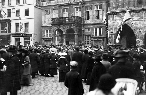 'Am Nachmittag verkündigte feierliches Glockengeläute der festlich geschmückten Stadt den Fall von Przemysl, der von den Russen mehrere Monate lang gehaltenen österreichischen Festung in Galizien. Am folgenden Tage wurde im Dom zum Dank für die Befreiung der wichtigen Feste ein feierliches Hochamt abgehalten. Die Schulen fielen wieder aus. Die Häuser ergänzten den farbenfrohen Schmuck der Kirchenfahnen durch patriotische Flaggen.'