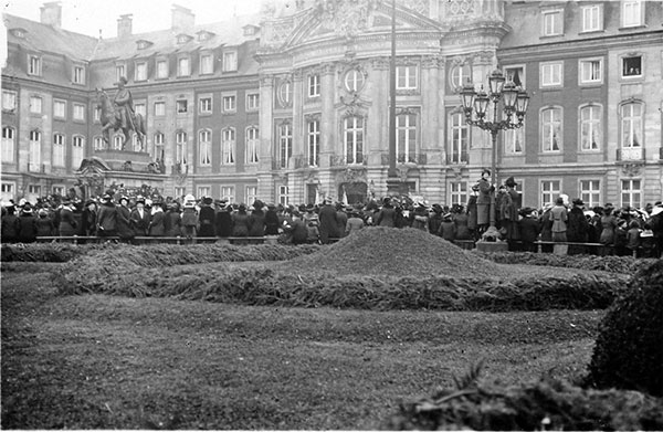 'Am Nachmittag wurden mit klingendem Spiel 24 Fahnen und Standarten aus den Heeresverbänden des VII. Armeekorps vom Bahnhof zum Königlichen Schloß gebracht. Der Stellungskrieg im Westen hat für die Verwendung der historischen Feldzeichen und Fahnen keinen Raum mehr. Unter einer Bedeckung von 120 Frontsoldaten wurden die Fahnen hierher überführt.'