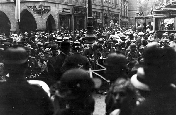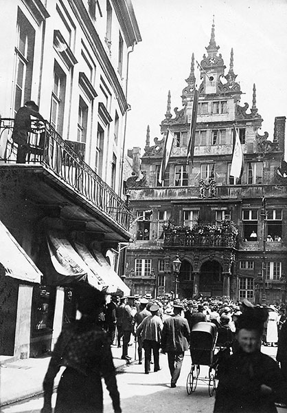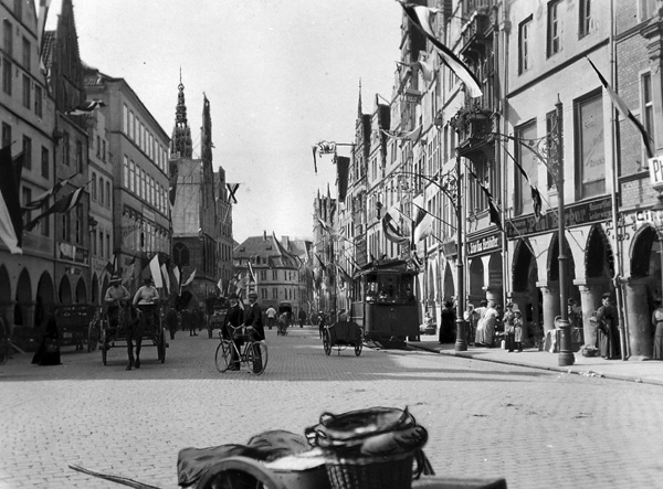 'Siegesgeläute, Siegesfahnen und festesfrohe Menschen verkündeten am Nachmittag die Einnahme Warschaus. Unter strahlendem Sommerhimmel drängte sich auf dem Prinzipalmarkte eine große, freudige Menge um die Infanteriekapelle, die dort ein Siegsständchen gab. Um 6 Uhr wurde noch die Eroberung Iwangorods gemeldet. Der Abend brachte eine unvergeßliche Feier.'