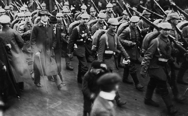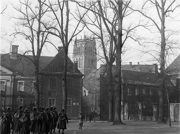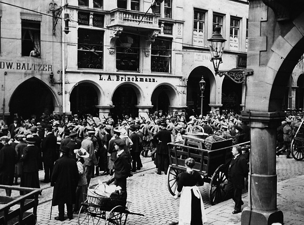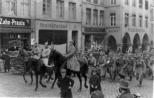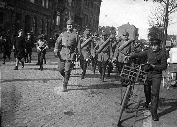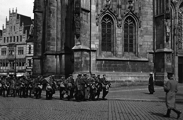 'In den letzten Tagen ist das militärische Straßenleben noch reger geworden. Große Trupps Landstürmer, altgediente Leute von 39-45 Jahren, manche schon mit grauem Haar, ziehen täglich vom Bahnhof durch die Stadt zu ihren Gestellungsplätzen. Auch viele Rekruten, Ersatzreservisten und unausgebildete Landstürmer von 20-22 Jahren füllen die Kasernen.'