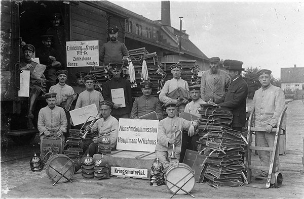 'In der Mittagsstunde rückten 750 Mann des Ersatzbataillons Nr. 13 ins Feld, zumeist junge Kriegsfreiwillige, auch einige Genesene. Unter dem Vorantritt von 2 Musikkapellen begleiteten zahlreiche Zivilisten singend und Hurra rufend den blumengeschmückten Transport. Die Maschinengewehr-Kompagnie hat gestern 78 Mann Ersatz gestellt.'
