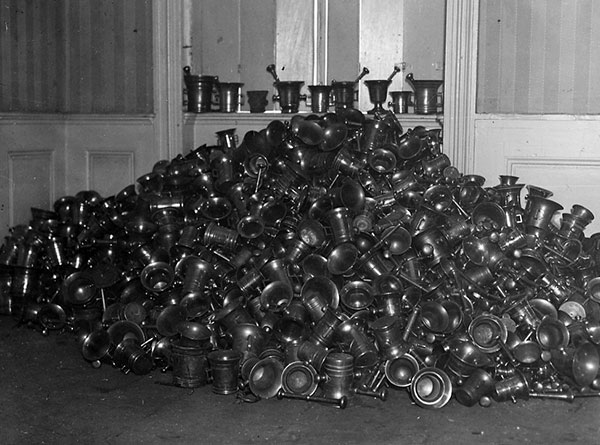 Als Ausweg aus dem Mangel an Rohstoffen werden die Produktion von Ersatzstoffen, die synthetische Produktion, strenge Rationierungen, systematische Altmaterialsammlungen oder auch die Abgabe von Metallen verordnet. Im September 1915 erfolgt erstmals die Beschlagnahme von Kupfer, Messing und Nickelgegenständen und die Schaffung einer zentralen Metallabgabestelle.